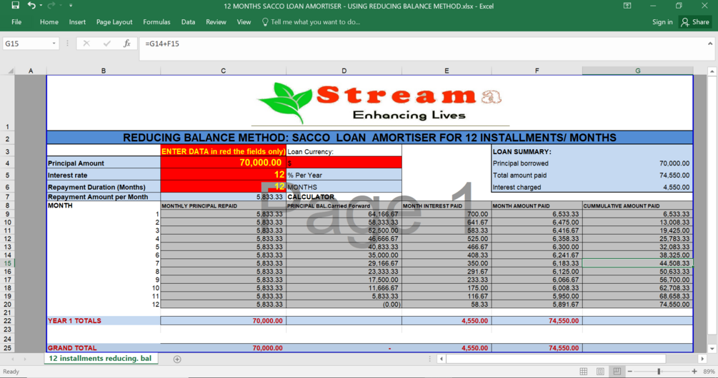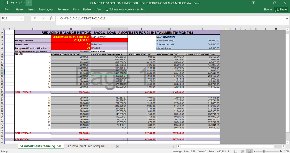 "Experience Financial Freedom Like Never Before with Our Reducing Balance Loan Calculator and Amortizer: Perfect for Individuals, SACCOs, Self-Help Groups, and Small Enterprises! With Easy Input for Principal Amount and Annual Interest Rate, Our Simple Template Generates Your Customized Loan Schedule in Seconds. Find the Perfect Balance Between Repayment Amounts and Loan Duration with Our User-Friendly Interface. Keep Track of Your Loan and Stay Ahead of Any Changes or Extra Charges. This Version Offers Up to 24 Months of Repayment Period, So Start Your Journey to Financial Empowerment Today!"